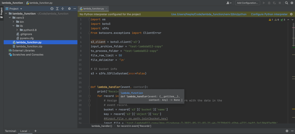 Add main python function file – which would be used to execute the code in AWS once uploaded – to the folder, this file will use the non-standard libraries to be installed. In my case: lambda_function.py file, with following content: